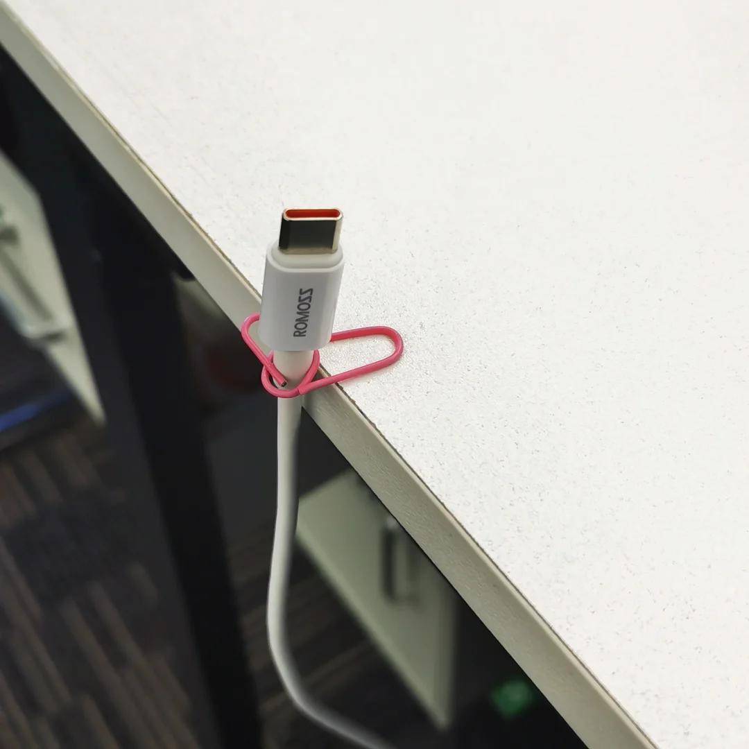 书桌、床头柜的数据线乱成一团,充电时找不到接头?不用买专门的固定器,回形针就能搞定。将回形针一端弯折后挂在桌边,另一端掰成小 “卡槽”,把充电头卡在里面,数据线绕着回形针缠半圈固定。这样一来,数据线整齐不凌乱,充电时随用随取,桌面瞬间清爽。