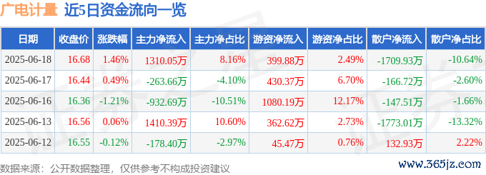 6月18日的资金流向数据方面,主力资金净流入1310.05万元,占总成交额8.16%,游资资金净流入399.88万元,占总成交额2.49%,散户资金净流出1709.93万元,占总成交额10.64%。